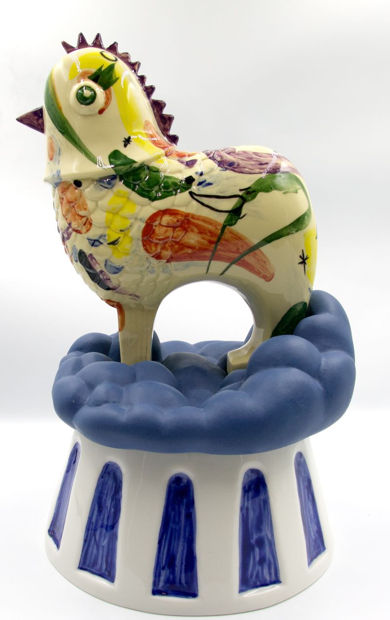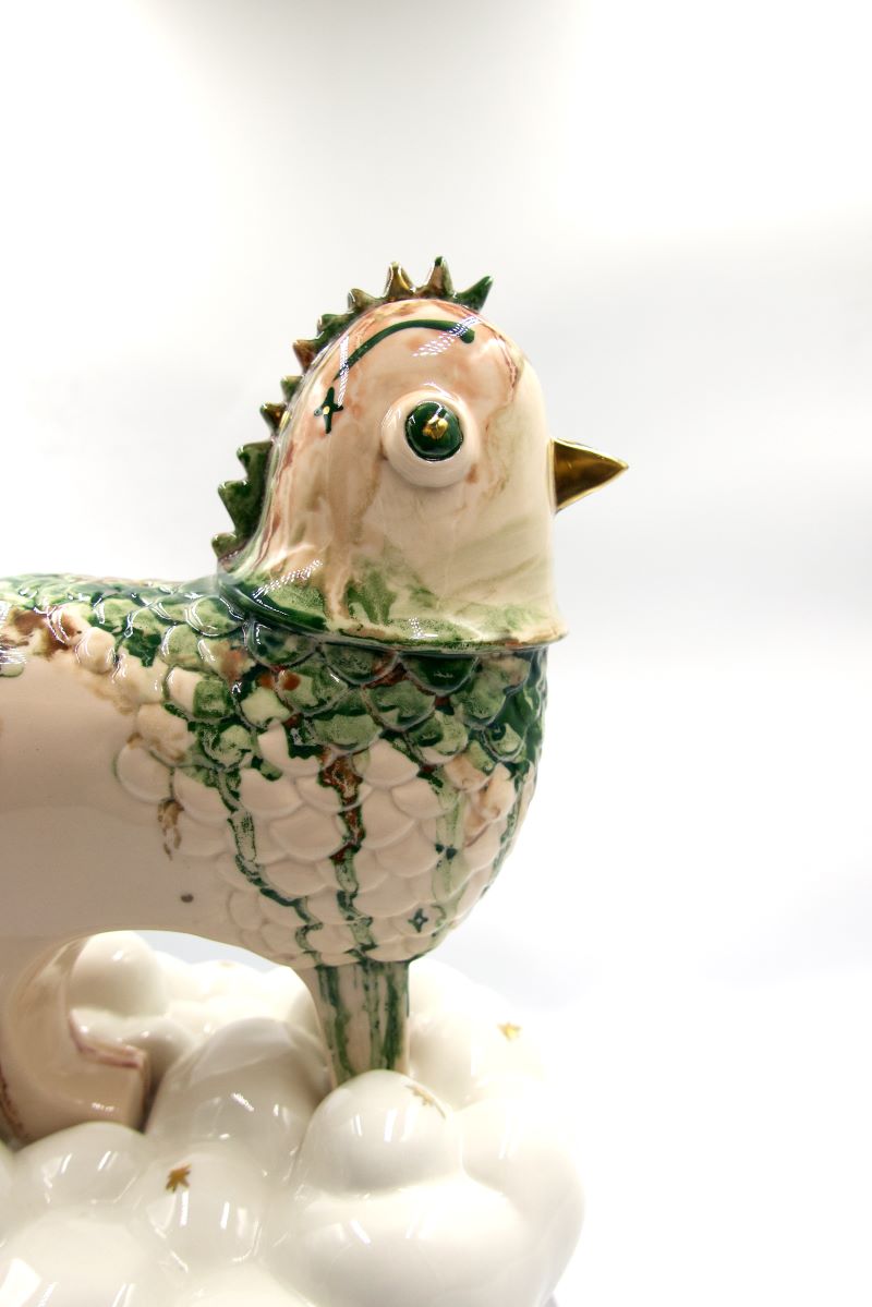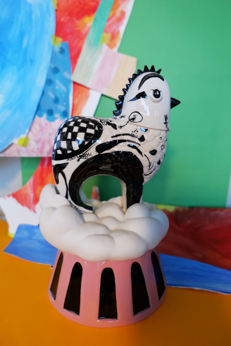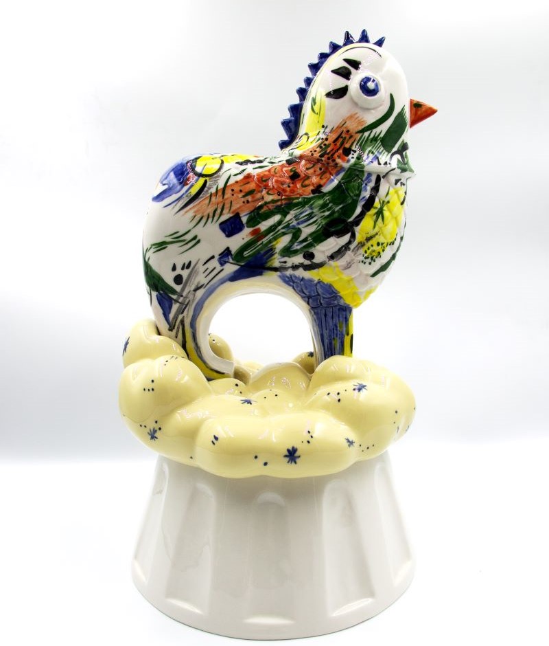 Lilianna handpaints the casts made from the molds and applies glazes by brushing, dripping, splattering and drawing for a variety of finished effects. She purposely leaves some white spaces for porcelain’s radiance and delicacy to show. The chickens have become vehicles for expression and new storytelling.
