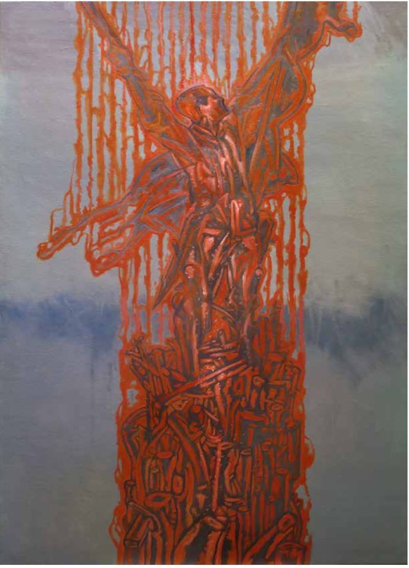 He is at his most biting when poking fun at the elites, whether they rule the world (like Israel is trying to do with Palestine) or the Philippines. In The Carbon Footprint of the Reluctant Martyr, done in oil and bitumen on primed canvas, it seems he is extracting the word “pain” from “painting” to portray the suffering of the people of Gaza with the continued bombardment by Israeli, or rather, Zionist forces. One can almost smell the burning bodies and pungent gunpowder.