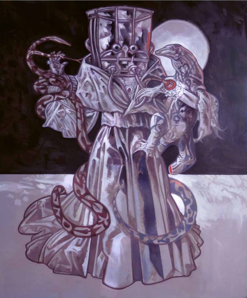 For Donya Victorina Makafili, oil and bitumen on primed canvas, the artist reserves his venom for what he calls “the elites whose hearts were always misaligned away from the Filipino masses and (who have) brought betrayal to a level where it was achieved with misappropriation of massive government funds that manifest in absurd luxury and spending.” The work is a study in gray, except for faint touches of red and blue here and there. Again the female figure is costumed in a traje de mestiza and is holding on its left arm a reptilian figure. Could it stand for the crocodiles in high and public places and whose appetite for money that isn’t their own is bottomless?