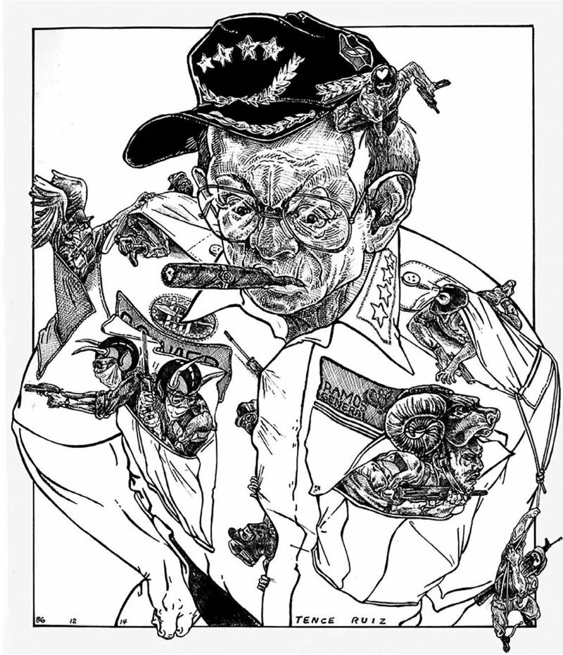 It depicts the former head of the Philippine Constabulary, the jailer of political dissidents during the Marcos dictatorship, the trademark tobacco in his mouth and rebellious soldiers in his pockets, sleeves and epaulets to signify the various coup attempts that sought to destabilize the Cory Aquino government. Fidel V. Ramos was also one of two main instigators (the other, the now centenarian Juan Ponce Enrile) of a putsch versus his relative and commander-in-chief, Ferdinand Marcos Sr., so he was no stranger to coups.