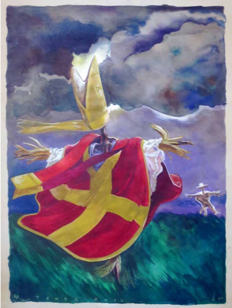 Scarecrow for the Scared, acrylic and colored inks on Fabriano paper, initially seems a breath of fresh air after the heaviness of the other subjects until one stares at the foreboding clouds above the two scarecrows, one a plain farmer’s tool to drive away birds and other pests, the other garbed in a cardinal’s or a bishop’s sacred vestments in royal red and yellow.