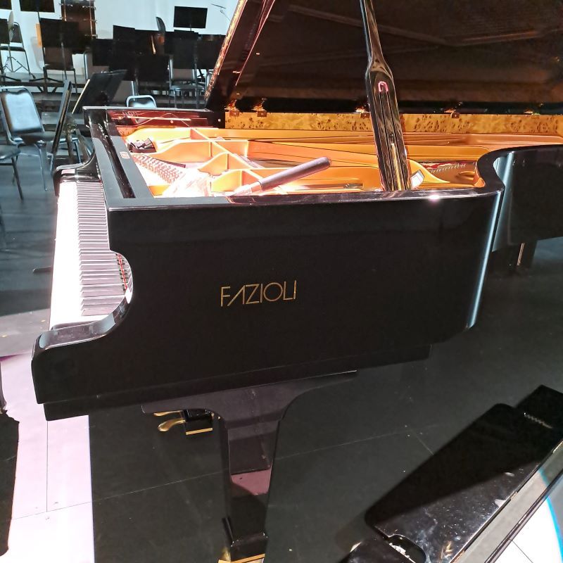 The full grand is a product of Fazioli Pianos, founded by the engineer and pianist Paolo Fazioli. Its brochure notes, “Passion for music, great artisanship, continuous technological research, and strict material selection.”