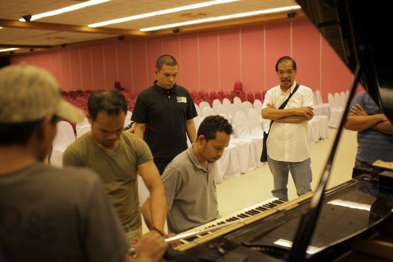 Three piano tuners in Baguio City inspect a piano to be used in 2018 outreach concert.