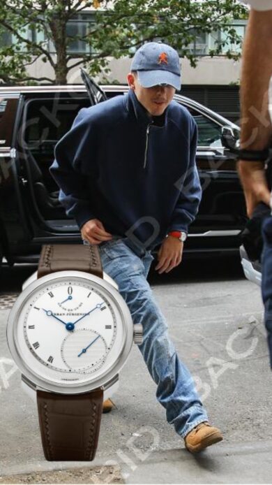 Actor Timothée Chalamet wears the UJ-2 with platinum case and silver dial from the new Urban Jürgensen collection with a custom orange strap while in New York to promote his forthcoming film Marty Supreme.