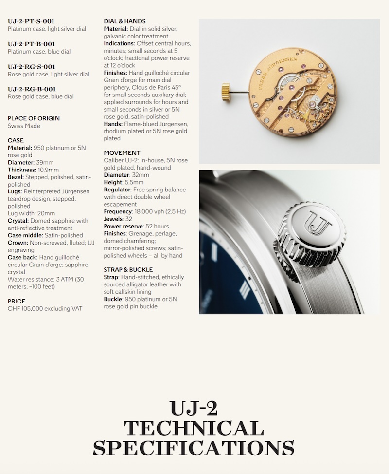 The Urban Jürgensen UJ-2 (CHF 105,000) is part of the newly introduced relaunch of Urban Jürgensen, one of watchmaking’s oldest and most storied houses. It is fully handmade and features a double wheel natural escapement, hand-turned guilloche dial and flame-blued hands. Each watch requires 565 hours of handwork by a master watchmaker to complete. Purchases are available via private appointment or through email. More details are available at UrbanJurgensen.com and @