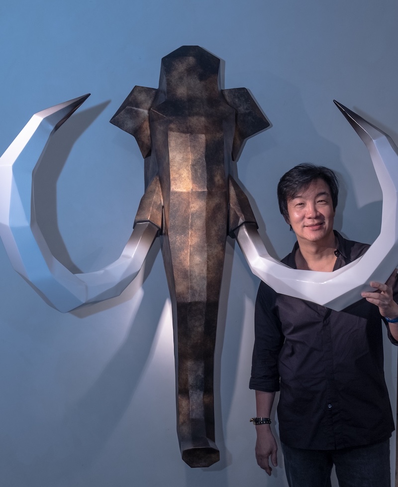 Jude Tiotuico, founder of Industria metalworks company, created Kaleidoscope, a combination of malleable steel and iridescent polyurethane tree form designed to evoke undulating movement. The piece is covered with Philippine silk butterflies dyed in rurungan by textile designer Olivia d’Aboville. Part of its beauty lies in the shadow it casts on the wall—a shifting play of light and form. “When light hits it at a certain angle, especially in a dark room, the shadow becomes more butterfly-like,” Tiotuico explains.