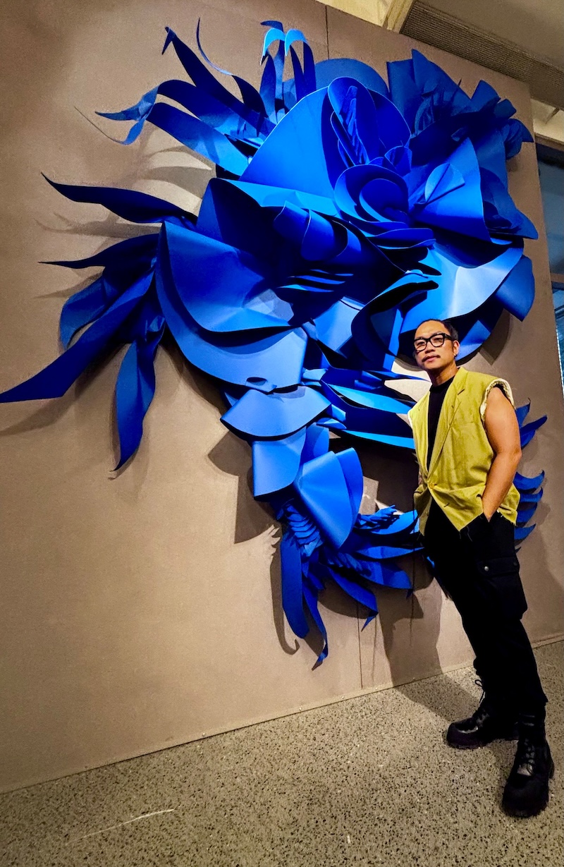 The piece is made of powder-coated aluminum, cut by hand “like paper cuttings,” he explains. Each petal is folded and shaped to create soft, curling edges. “It’s not a delicate or nice flower,” he says with a laugh. “It’s a monster flower—one with energy.” A badass flower, perhaps?