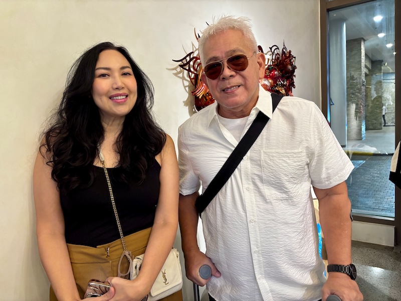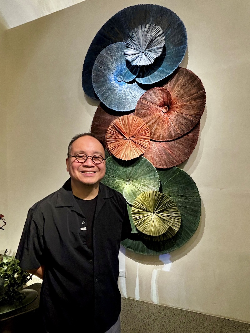 Several of Leeroy New’s works in Subterra feature woven cogon disks created by a community in Cadiz, Negros Occidental. New guided the artisans in developing the forms and color schemes, then stitched the pieces together for his installation. Over time, these disks have evolved into wearable art. The exhibit includes necklaces made from the same materials, and Ina Gaston of Hacienda Crafts has even fashioned a vest out of the woven disks. From this collaboration, Gaston developed its fashion accessories line, “Uma Mi,” which means “our farm” in Bisaya.