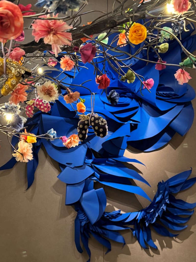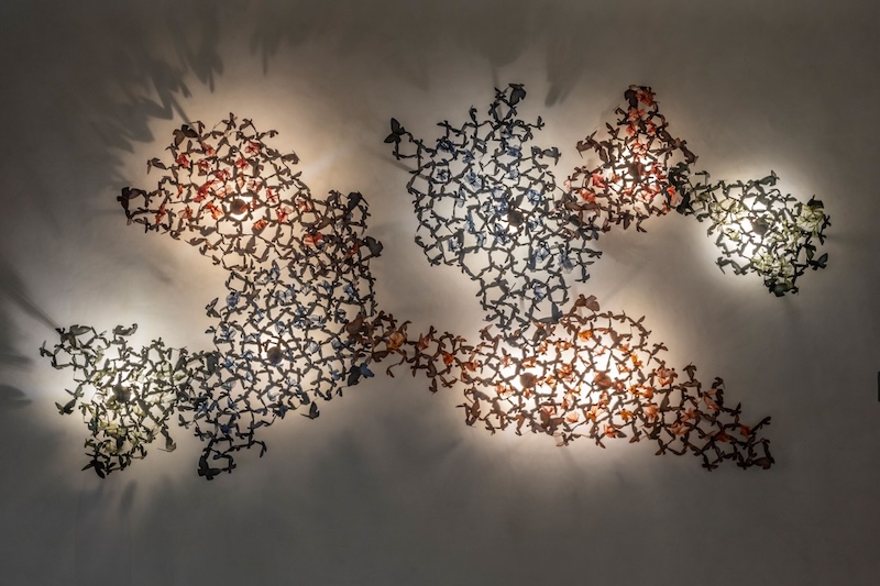 Kaleidoscope 2, another of Tiotuico’s wall sculptures, is a lattice of over a thousand tiny steel branches filled with fabric butterflies. When light strikes it, the work comes alive, casting shadows that deepen the illusion of flight. A smaller tabletop version, Kaleidoscope Bonsai Sculpture, continues this theme of transformation—metal turned delicate, structure turned motion.