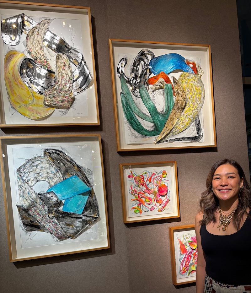 On the wall, Manahan presents paper sculptures from her Notes to the Self Series, where layers of hand-cut paper form dimensional landscapes of emotion and memory. “I started around 2023,” she recalls. “I wanted to illustrate memories and emotions—quiet moments, textures I notice in daily life, like asphalt or clouds, the way they form brushstrokes.” Using different papers, from bamboo to alpaca-based, she combines metallics, blacks, and whites to create tactile meditations on feeling and reflection.