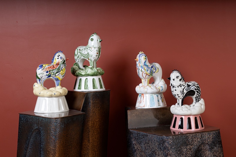 Her Mechickens series features three-legged porcelain chickens rendered in her signature quirky style. “I work with a porcelain manufacturer, then hand-paint everything after, so each piece is unique,” she explains. The work was inspired by her grandmother’s collection of fantastical animals—a childhood memory reinterpreted in clay. “It’s kind of an ode to my childhood,” she says. “Porcelain fascinates me. It’s delicate but can become anything. Even though it’s been around for hundreds of years, there’s still so much to explore.”