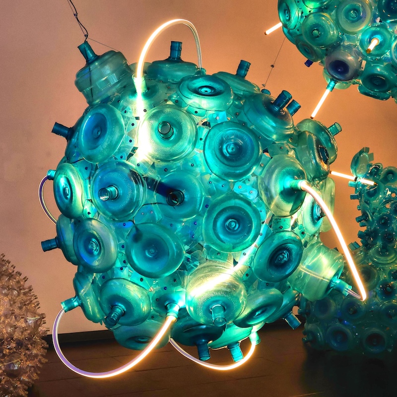 His lighting installation Nimbus continues this practice of reinvention. Made from five-gallon water containers cut, riveted, and reassembled, the work glows like a translucent cluster of bubbles—industrial waste reborn as ethereal light.