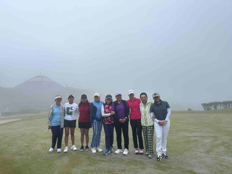 Braving the morning fog hovering the Highlands Golf course are Maline Flores, Gabby Borja, Cathy Borja, Mabek Kawsek, Jenny Bosch, Lette Fernandez, Jackie Kawsek, Marissa Vergara, and Arlette Raquino