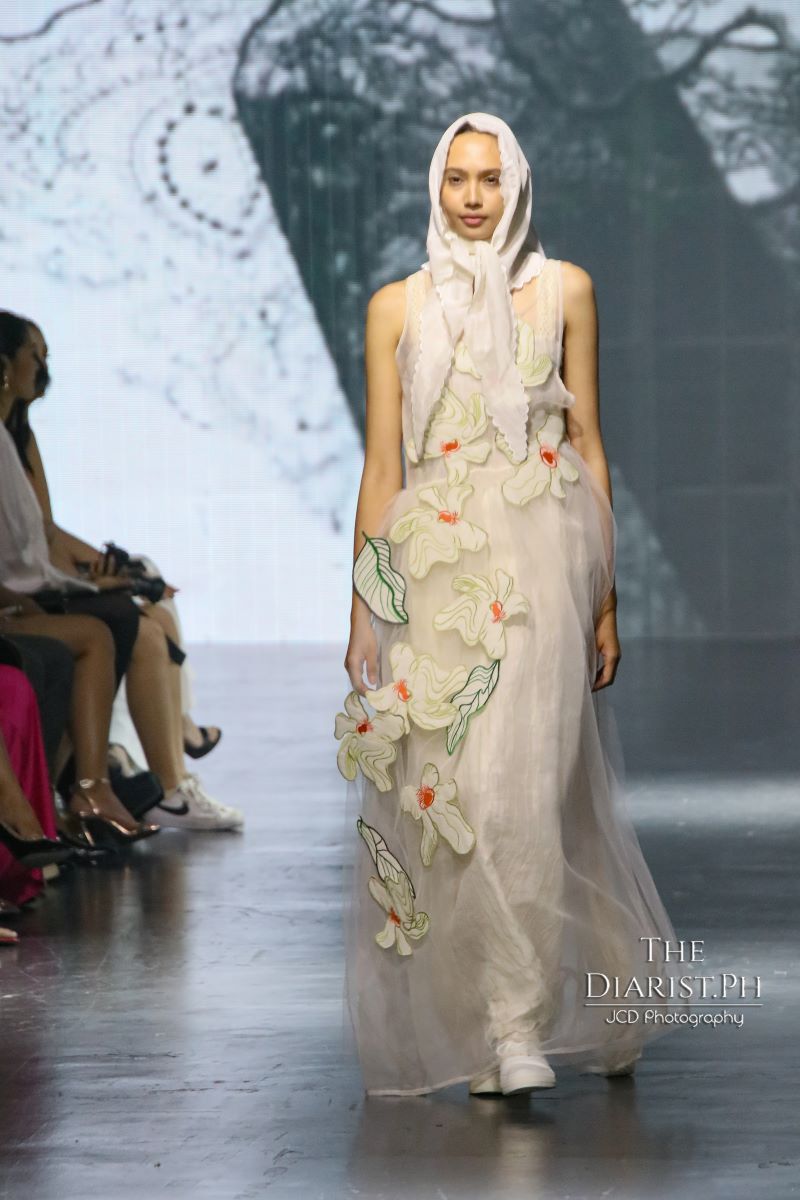 On the day of the show, I wasn’t really expecting anything. But when I first saw her works on the runway, I wondered, “Why is it simple?” I mean yeah, simple is great, but I didn’t expect it. I was overthinking it—“Well, Ate’s style is simpler now. More minimalist.” But then I saw her “bride” come out with Ate’s signature flower apron and bandana, I was like, “Woah! There she is!” It wasn’t the only one, as after that, other models paraded her signature designs. I knew then that I liked this collection more than last year’s. Ate Gabbie has created such a body of work that she can just get from these different pieces and create something new. I was amazed how each design throbbed with its own life, gliding from one look to another on the runway.